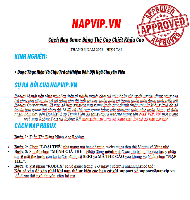 • Bước 4: Vật phẩm “ROBUX” sẽ về game trong 15 Phút - 120H ( sẽ xử lí nhanh nhất có thể )